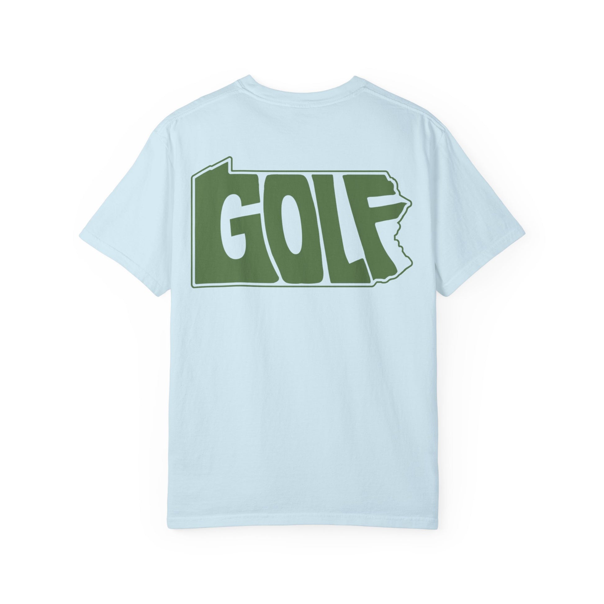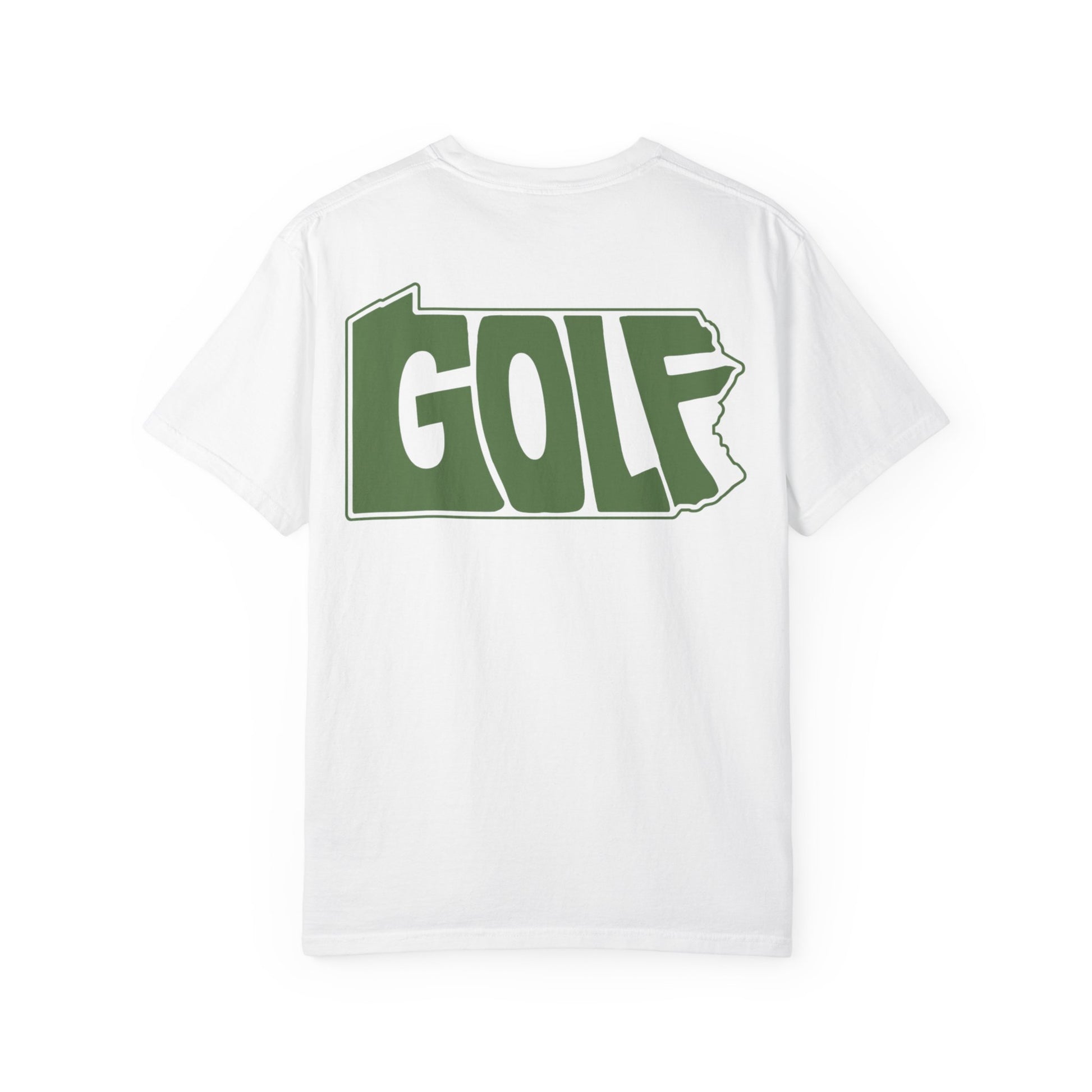 A bold graphic take on Pennsylvania golf. This design fills the outline of Pennsylvania with the word GOLF, trimmed tightly to the state’s shape for a clean, no-frills look that’s instantly recognizable.